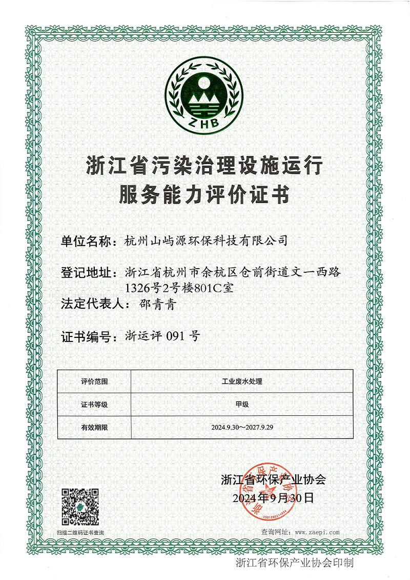 浙江省污染治理設(shè)施運(yùn)行服務(wù)能力評價證書