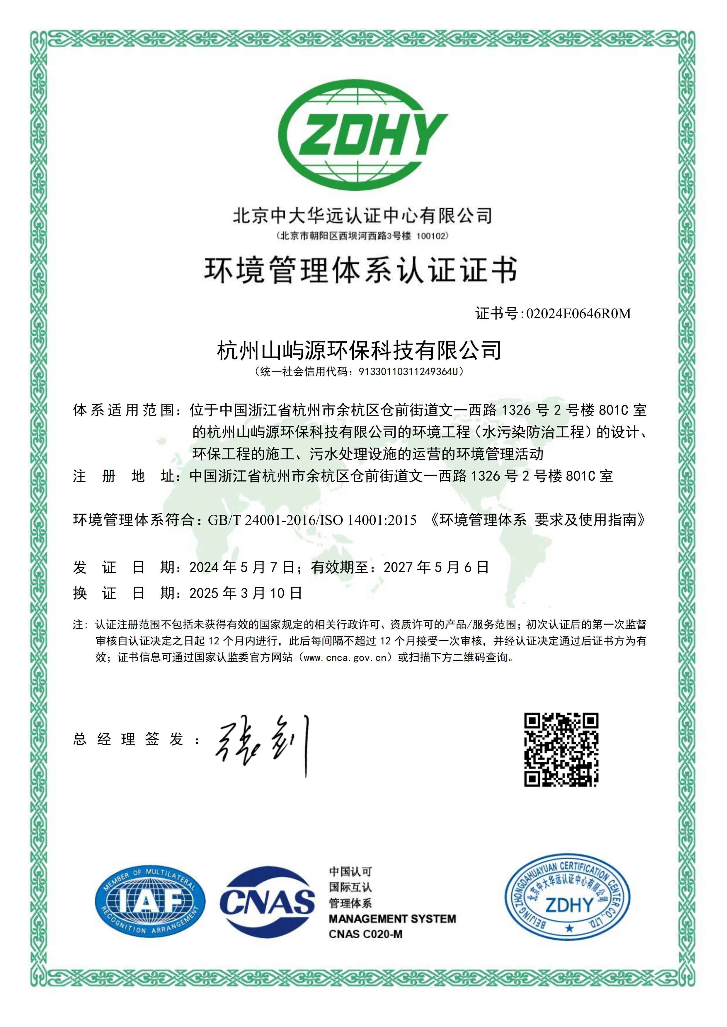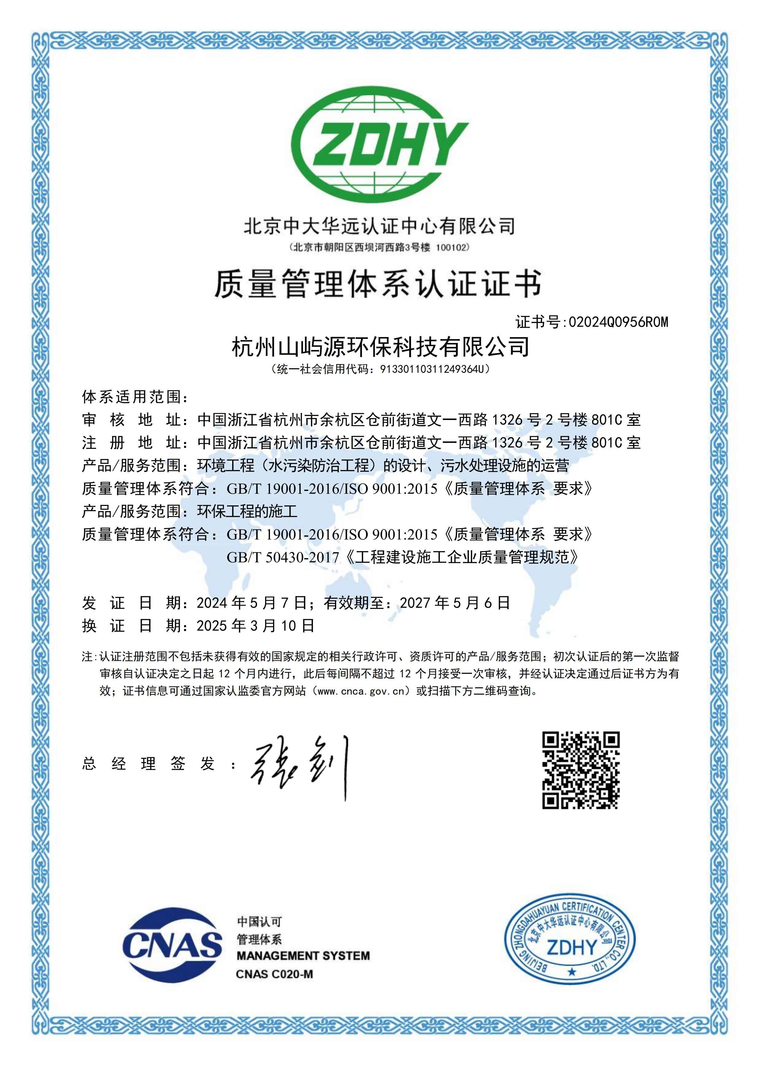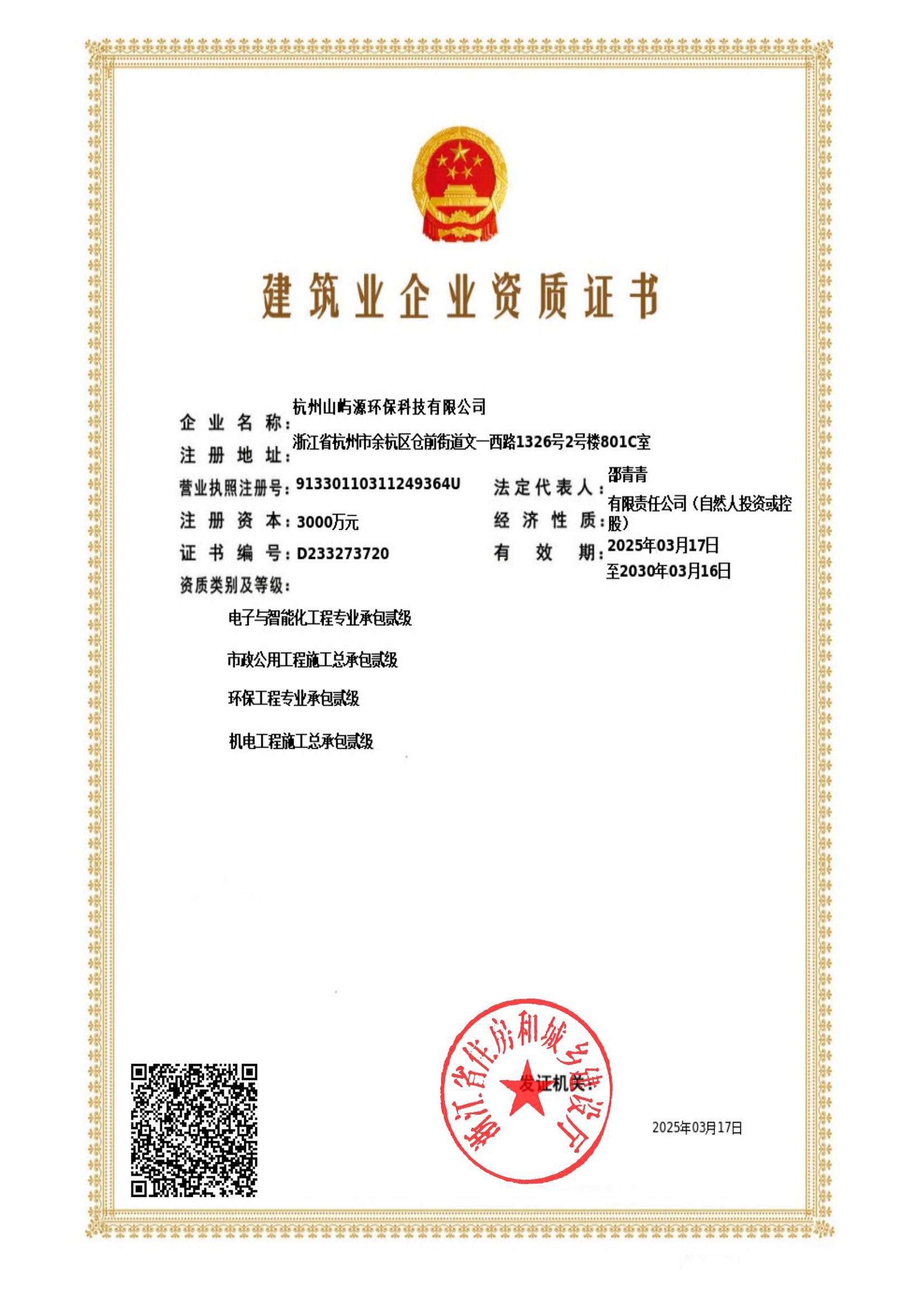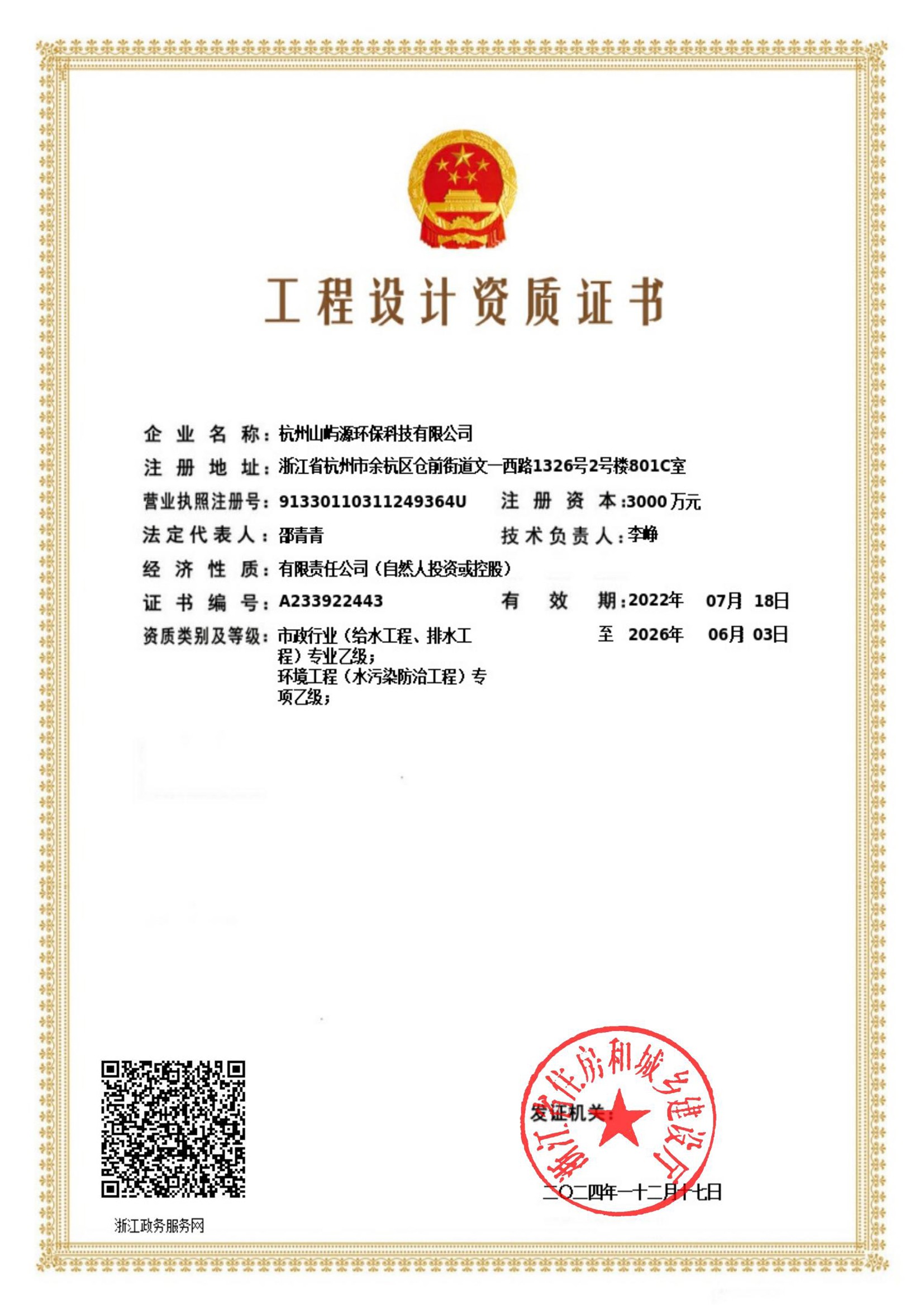 山嶼源環(huán)保,是國家高新技術(shù)企業(yè)、國家科技型企業(yè)、浙江省專精特新企業(yè)、浙江省環(huán)保產(chǎn)業(yè)協(xié)會會員單位、廣東省造紙行業(yè)協(xié)會會員單位、市級高新技術(shù)研發(fā)中心、杭州市專利示范企業(yè)。公司具有環(huán)境工程(水污染防治工程)、市政行業(yè)(給水工程、排水工程)設(shè)計(jì)資質(zhì)、環(huán)保工程專業(yè)承包資質(zhì)、電子與智能化工程專業(yè)承包資質(zhì)、市政公用工程施工總承包資質(zhì)、機(jī)電工程施工總承包資質(zhì)。
